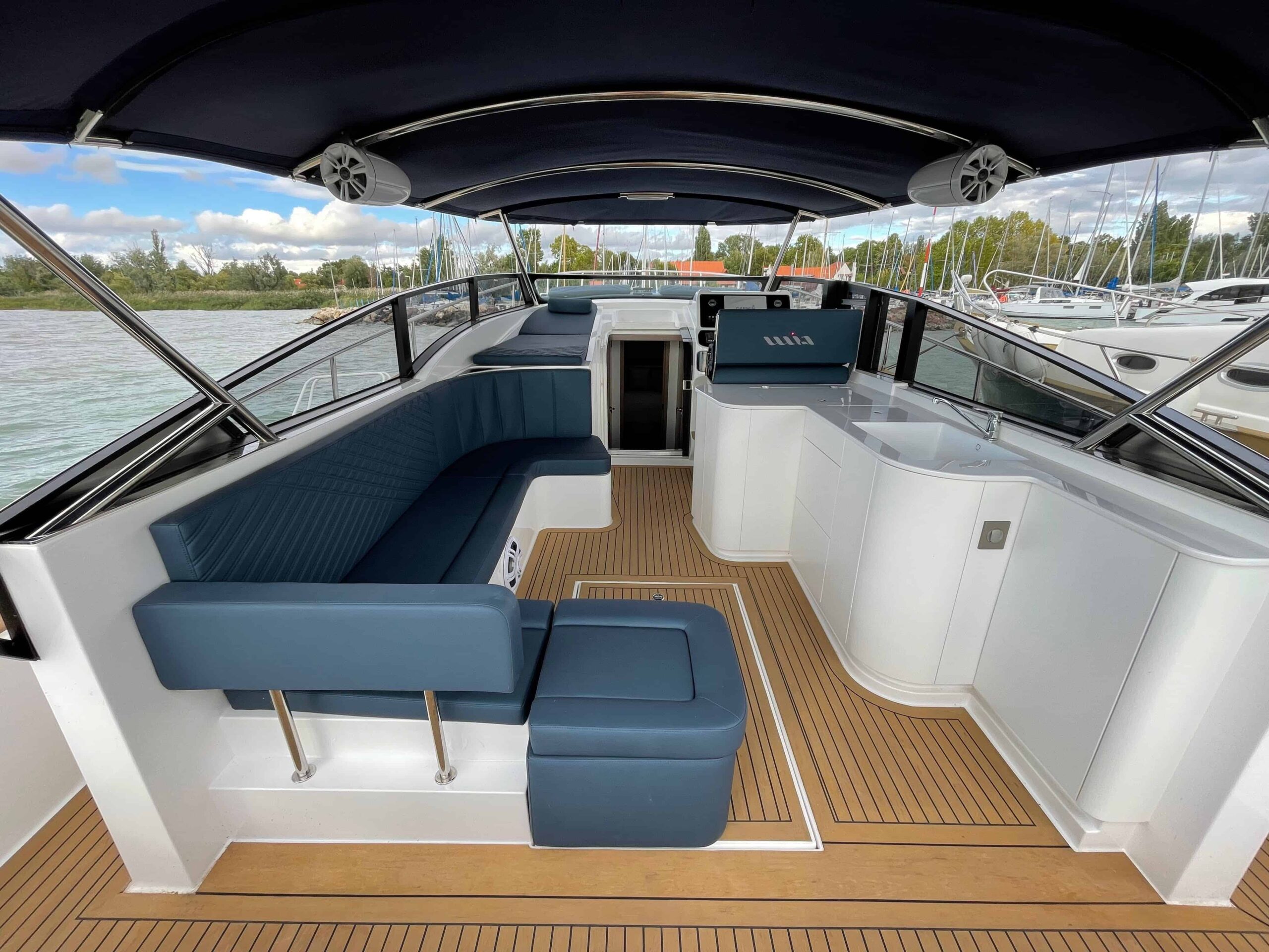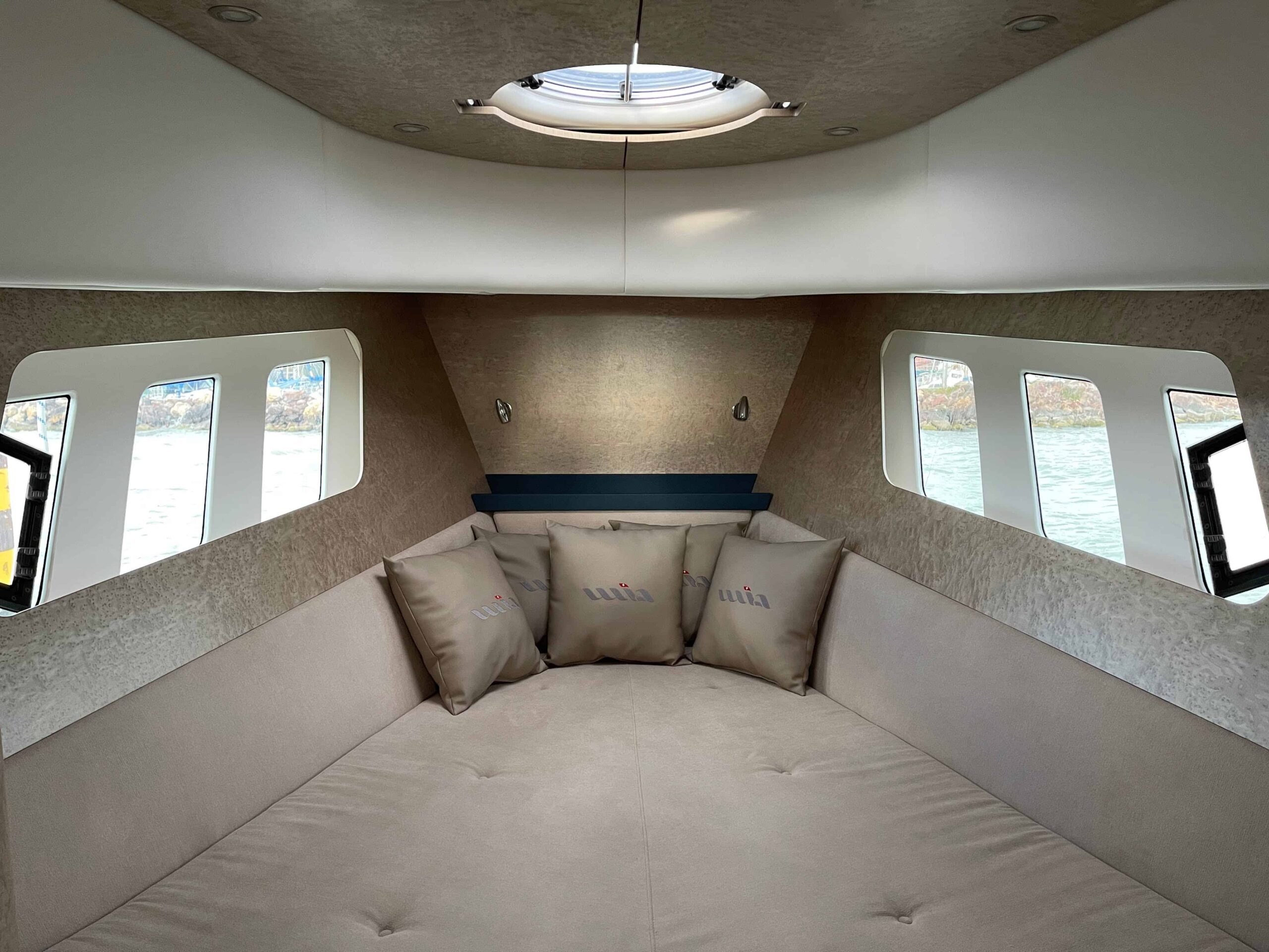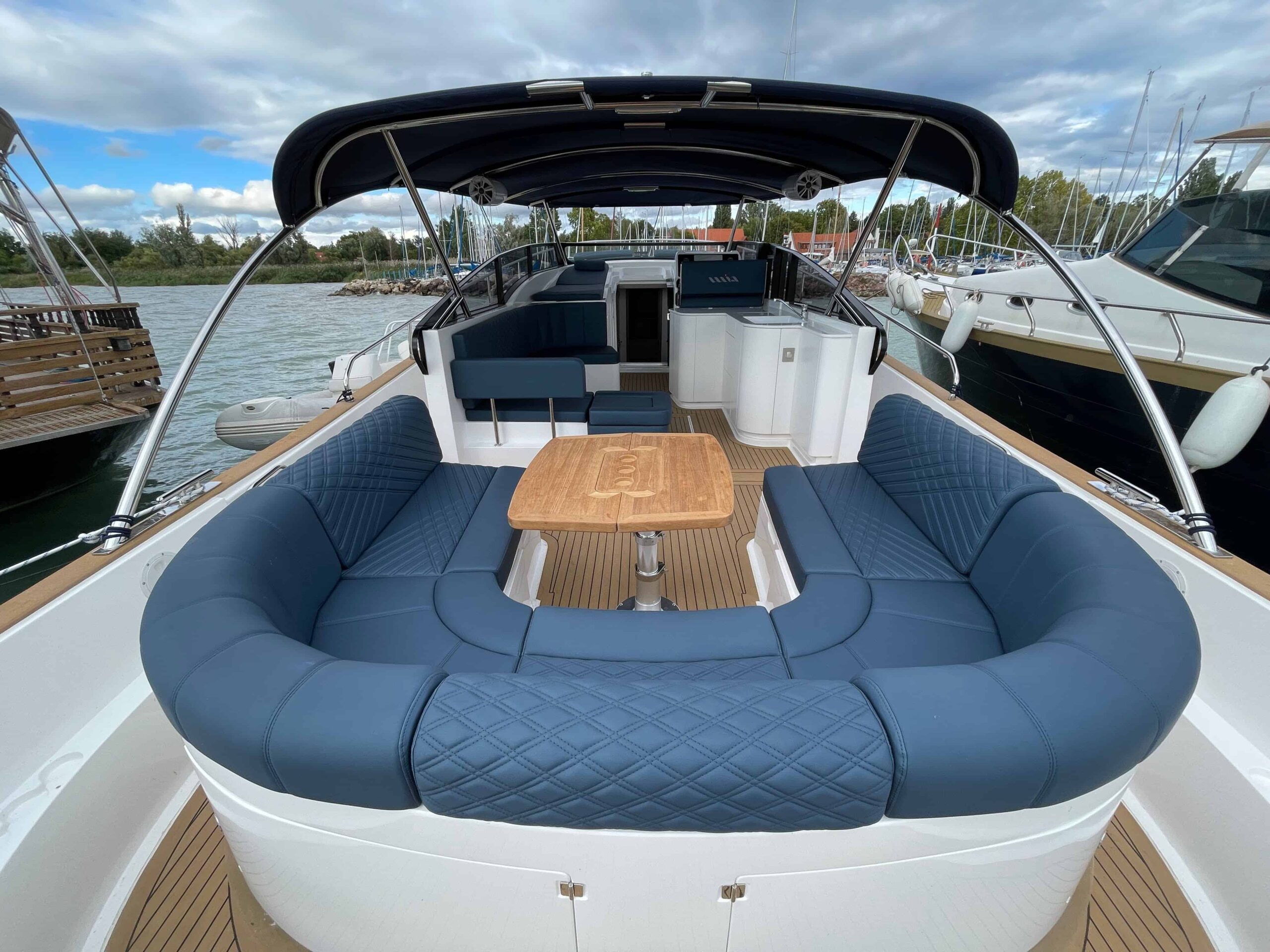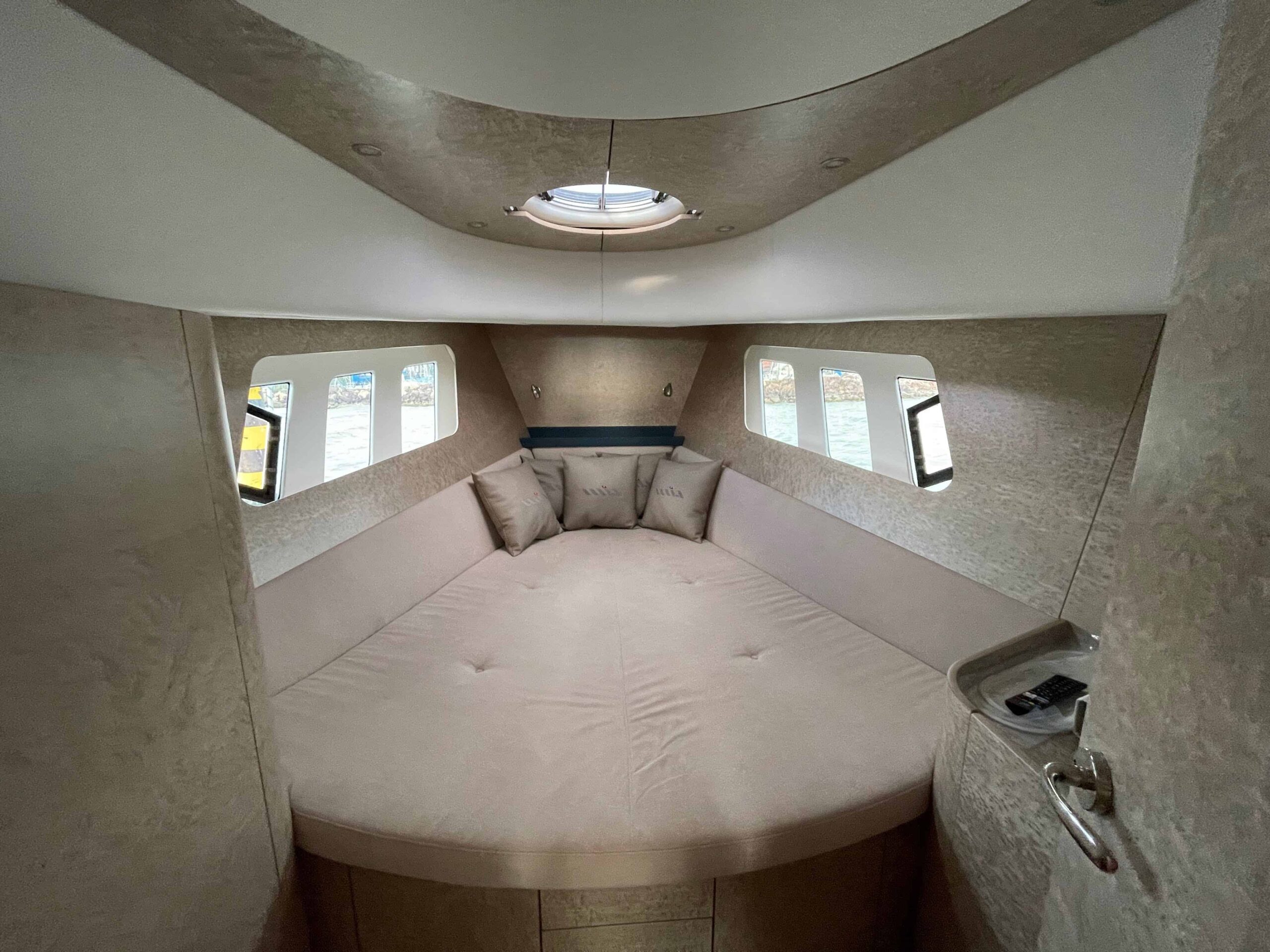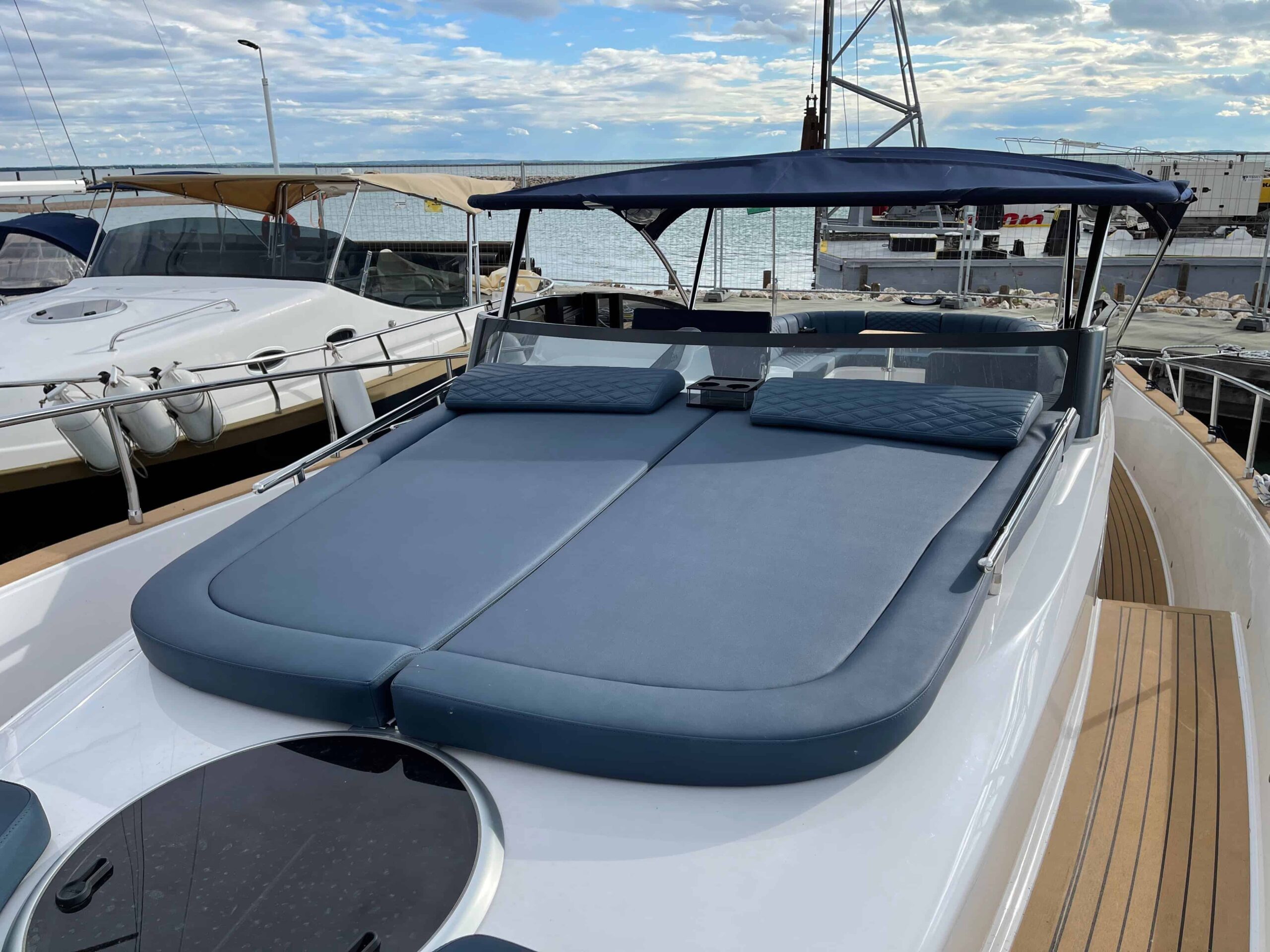 A hatalmas bimini alatt prémium minőségű kárpittal bevont kanapé, a hajó orrfedélzetén dupla napozó található. Egyszerre akár 12 személy is hajózhat a fedélzeten, kényelmes fekvőhely pedig 6 fő számára áll rendelkezésre 3 luxus kabinban.