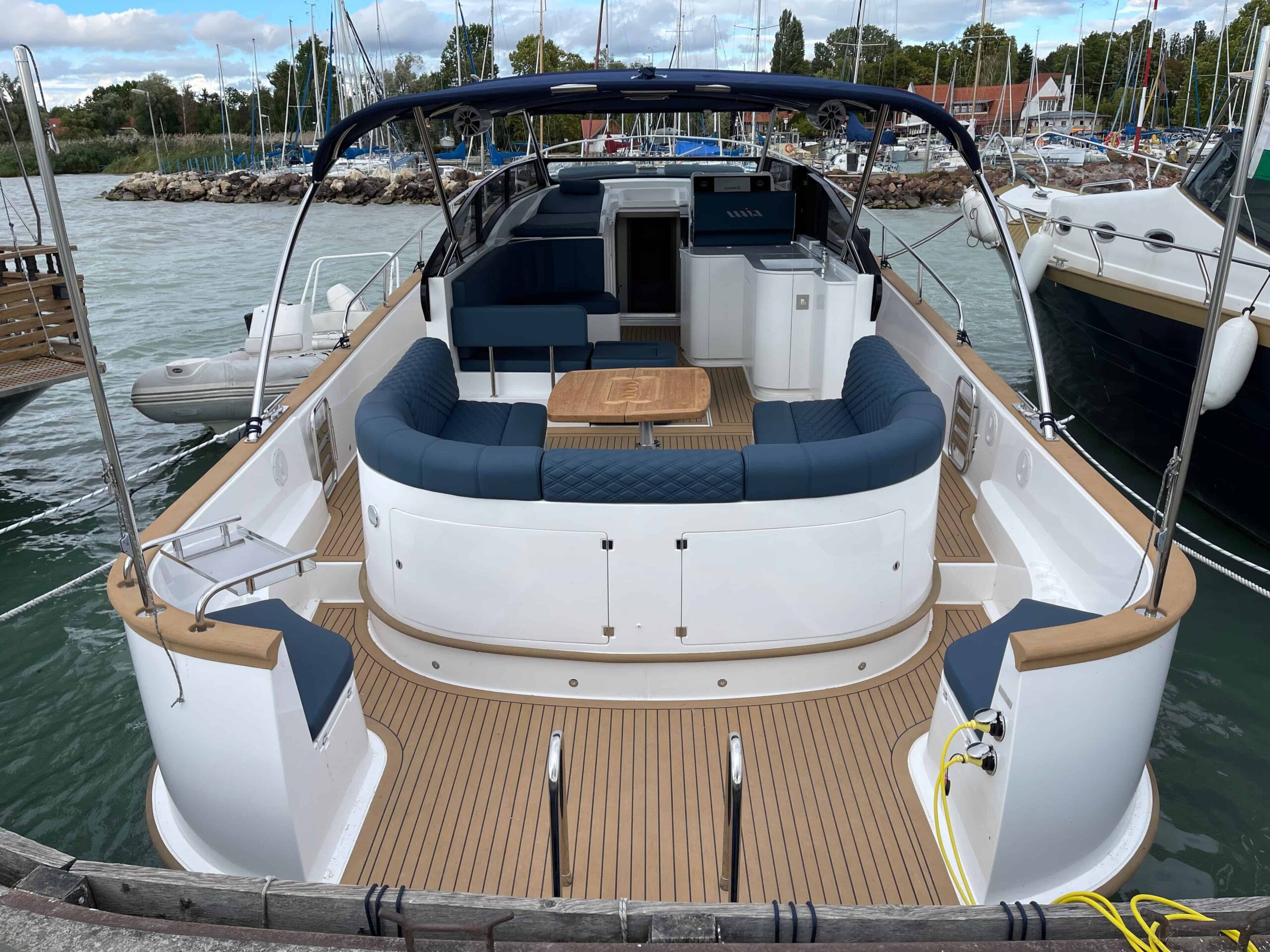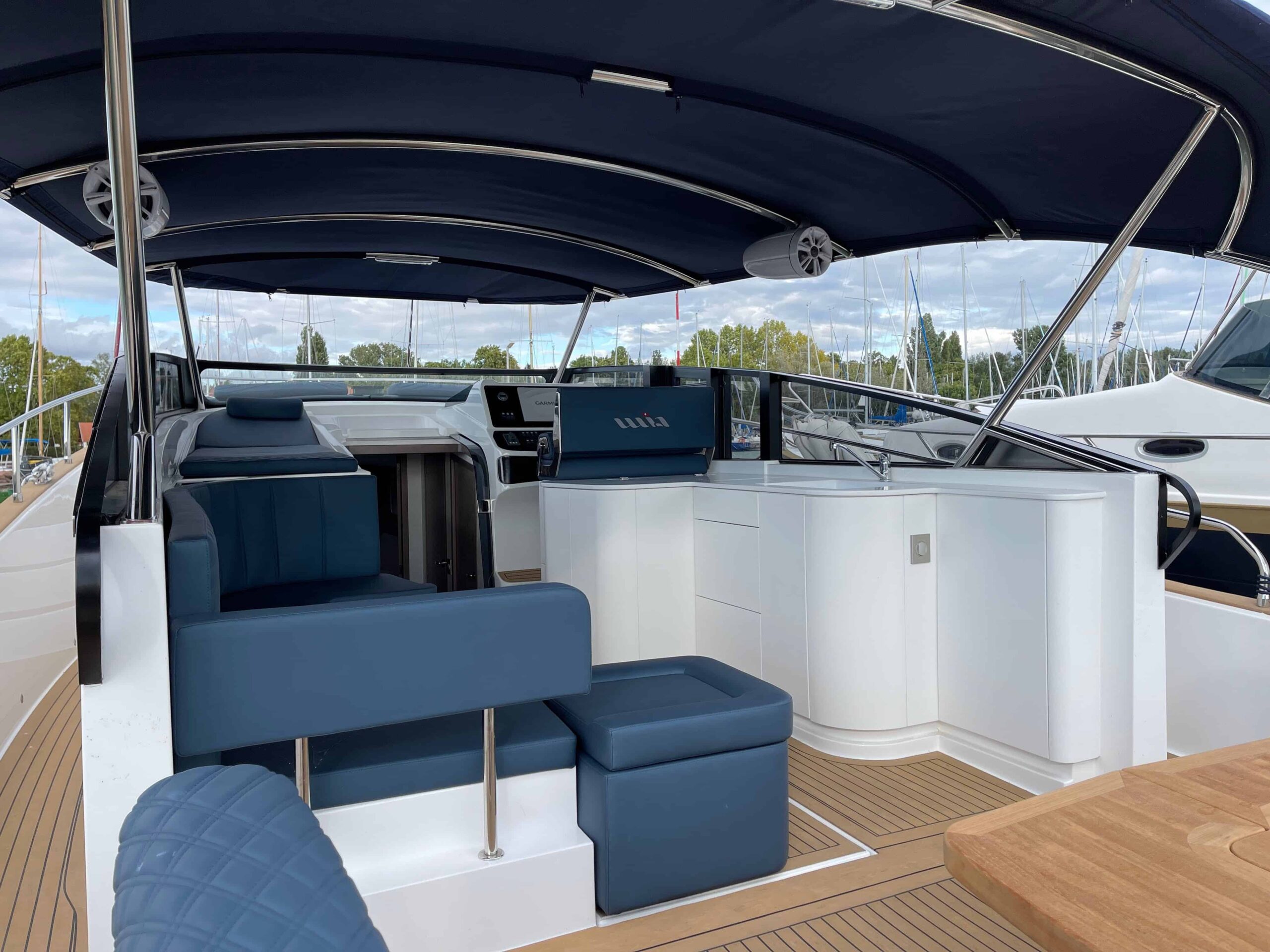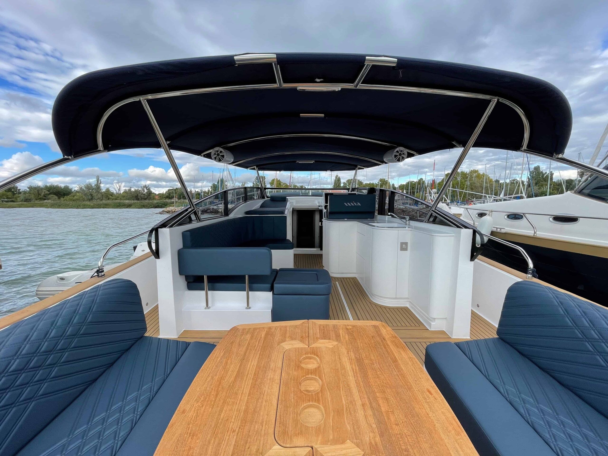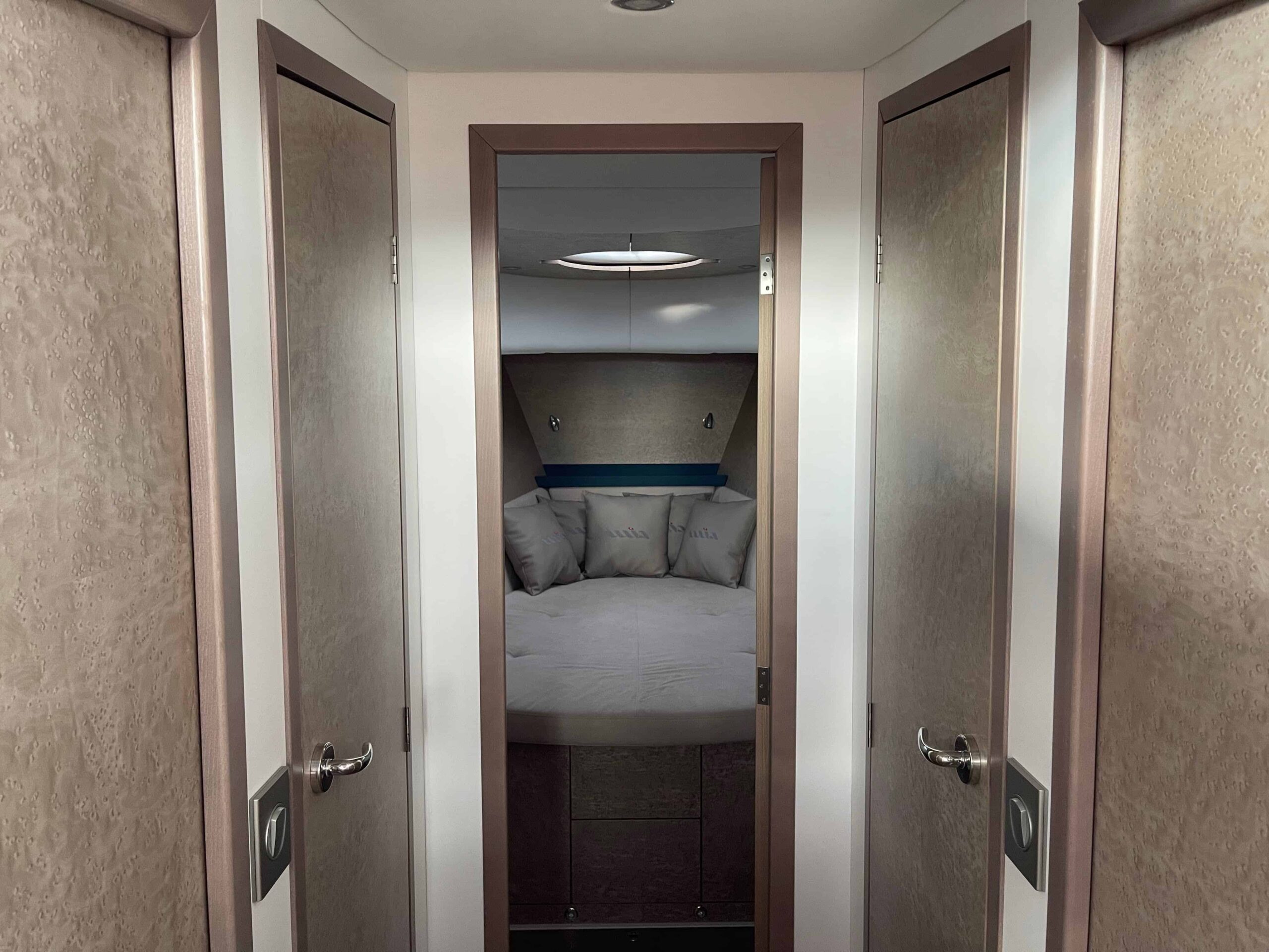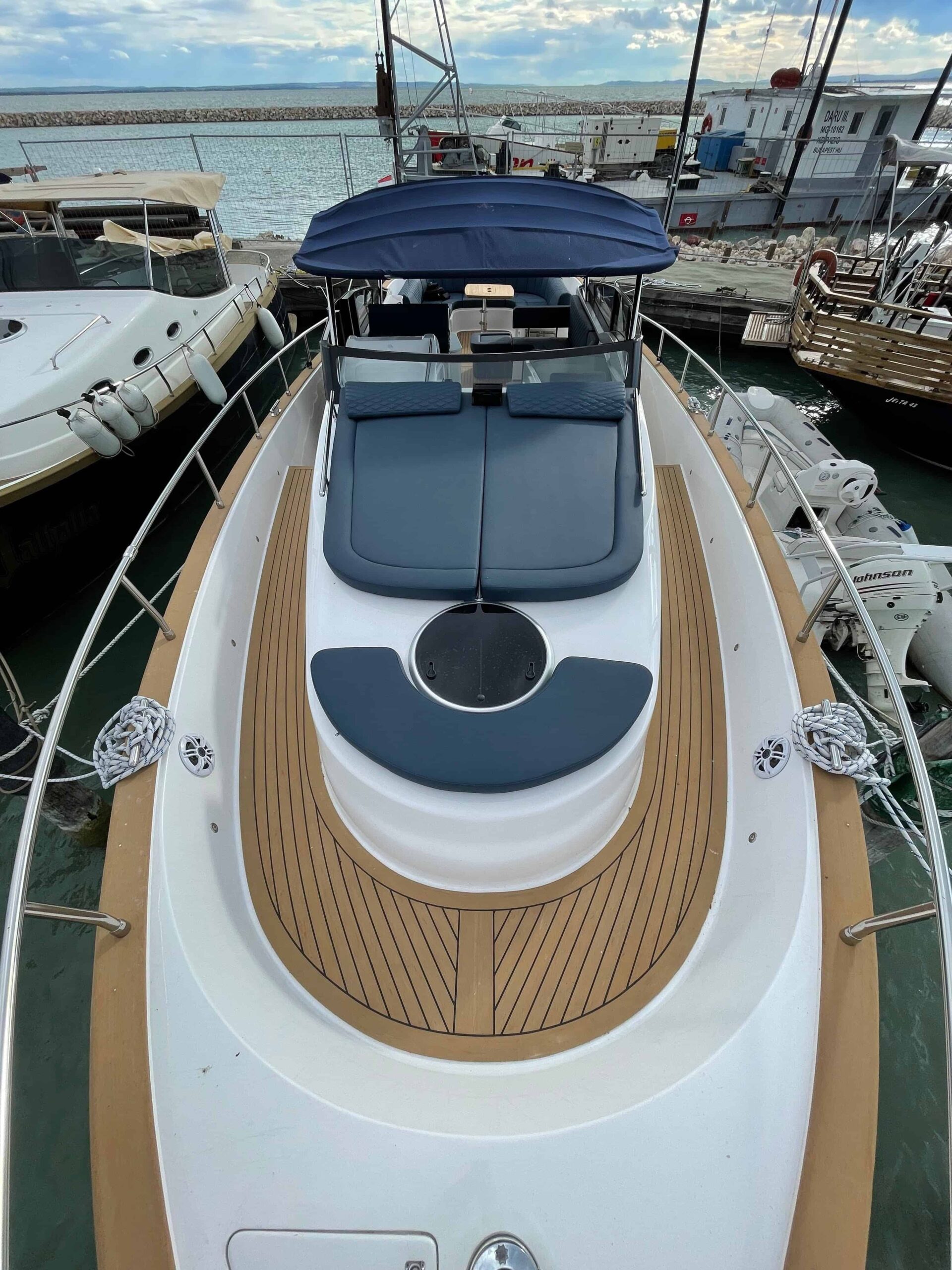 A hatalmas bimini alatt prémium minőségű kárpittal bevont kanapé, a hajó orrfedélzetén dupla napozó található. Egyszerre akár 12 személy is hajózhat a fedélzeten, kényelmes fekvőhely pedig 6 fő számára áll rendelkezésre 3 luxus kabinban.