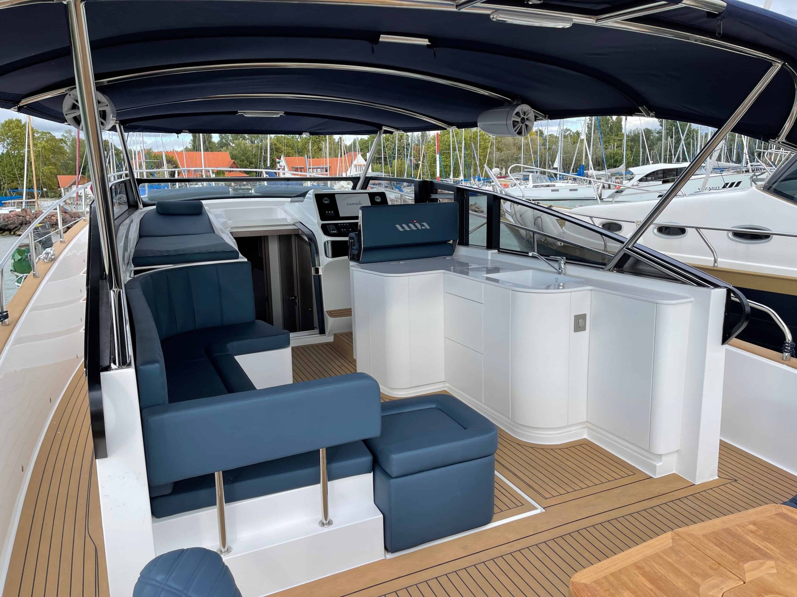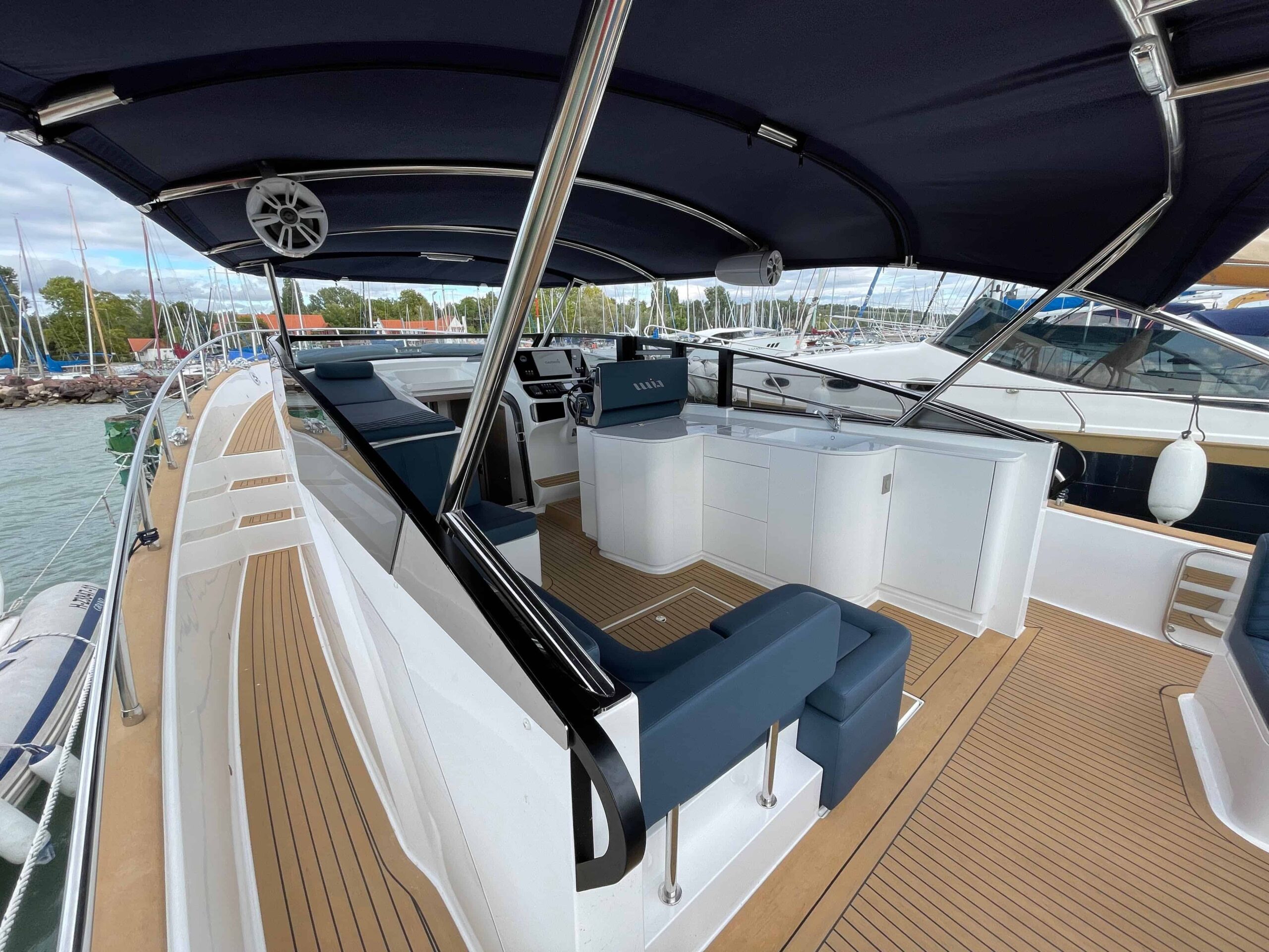 A külső részen prémium konyha található dupla hűtővel, elektromos főzőlappal és egyedi kialakítású grill sütővel. A jacht külső és belső zuhanyzóval, valamint beépített automata WC-vel is felszerelt.